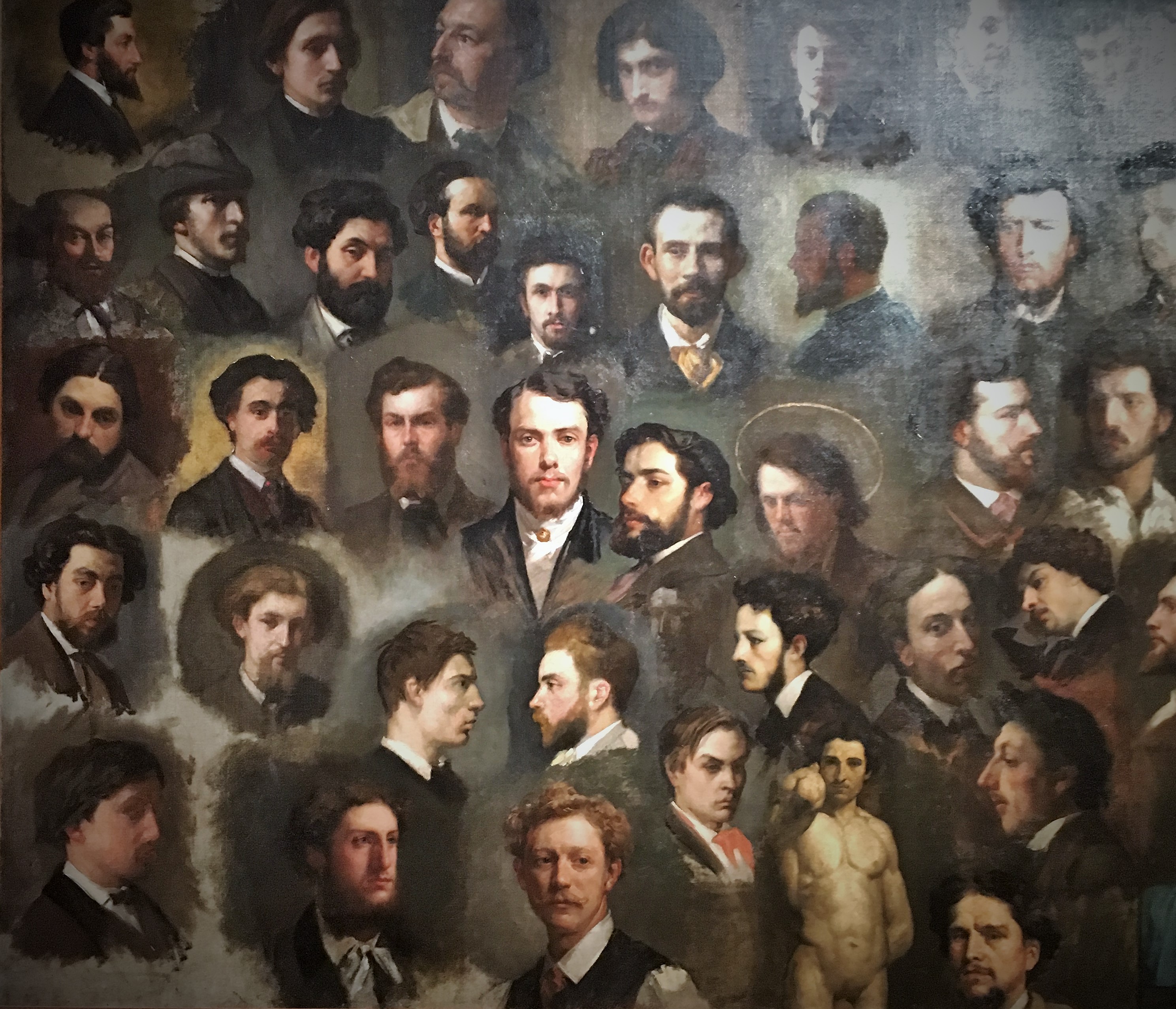 Panneau des élèves de l’atelier Gleyre au cours des années 1860. On reconnaît Firmin-Girard à la deuxième place de la troisième rangée en partant du bas, à sa droite Sisley et sous ce dernier Renoir.
