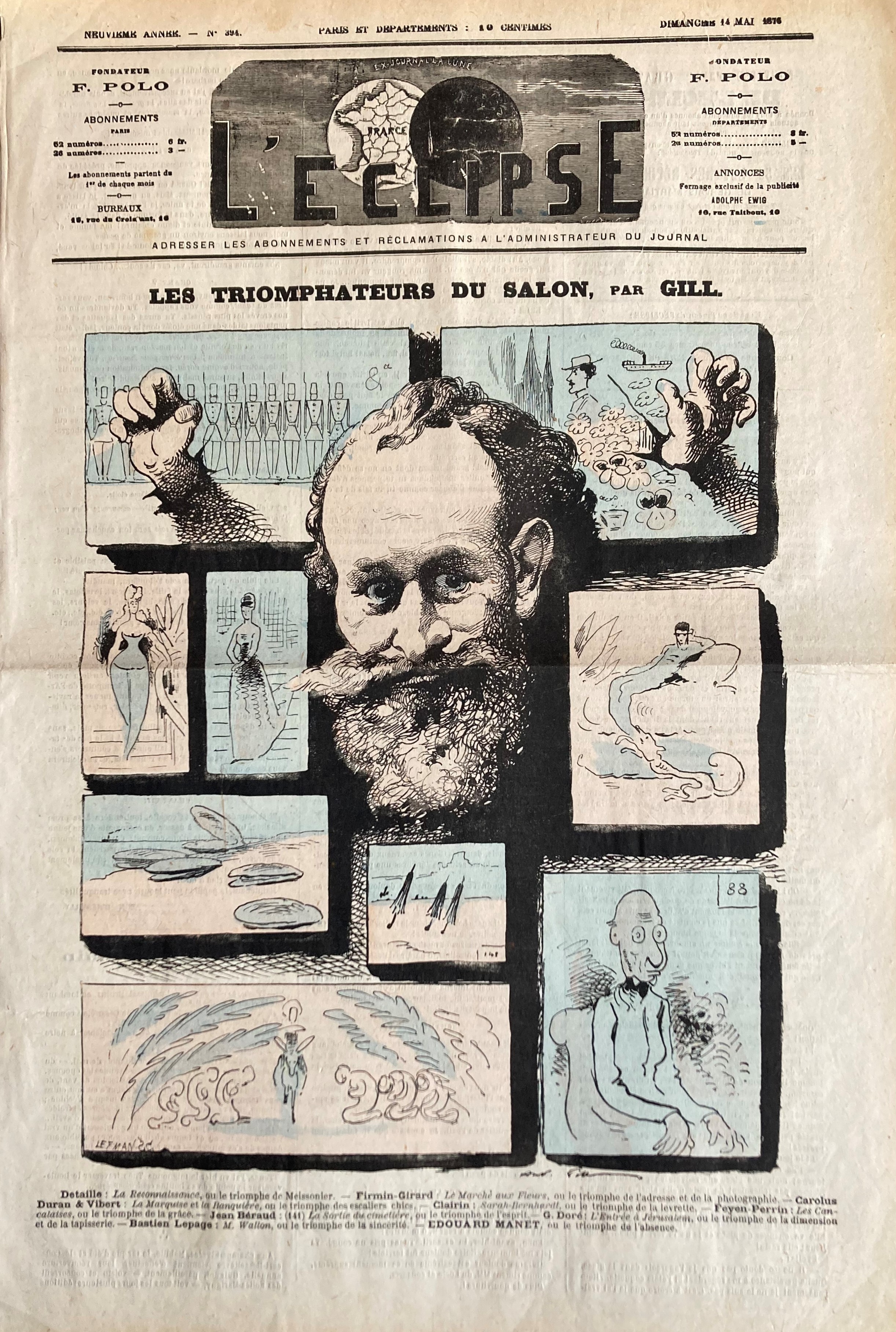 André Gill, célèbre caricaturiste, présentait, dans le journal L’Eclipse du 14 mai 1876, Les triomphateurs du Salon au premier rang desquels Firmin-Girard et Georges Clairin. Sept autres peintres figuraient aussi au palmarès de l’Eclipse dont le dernier mentionné Edouard Manet décrit comme le triomphe de l’absence. Le Jury du Salon de 1863 avait en effet refusé d’exposer son « Déjeuner sur l’Herbe » qui avait alors pris le chemin du Salon des Refusés, autorisé par Napoléon III. Deux ans plus tard il faisait scandale avec son « Olympia » et ne sera plus exposé au Salon, l’année suivante son « fifre » n’ayant pas été accepté.