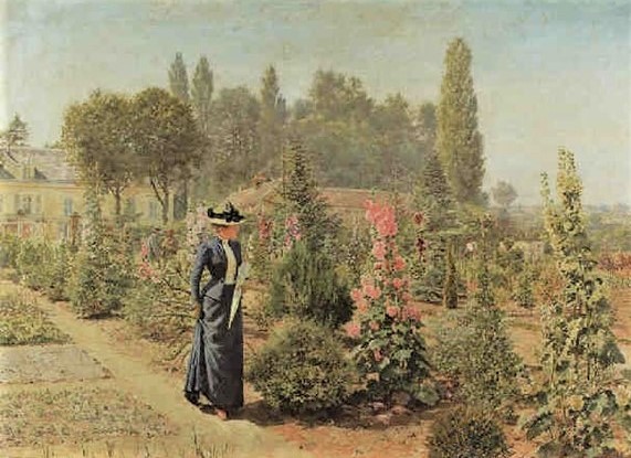 - ‘L’Automne’ Ð autumn scene with woman and dog on steps in front of house, girl on drive holding flowers and umbrella and trees in autumn foliage