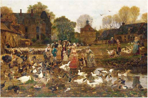 - ‘L’Automne’ Ð autumn scene with woman and dog on steps in front of house, girl on drive holding flowers and umbrella and trees in autumn foliage