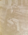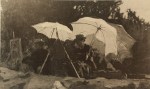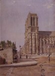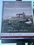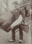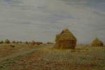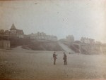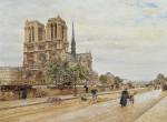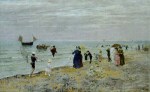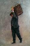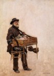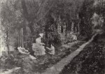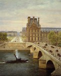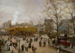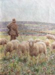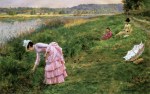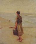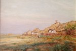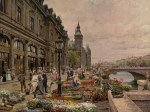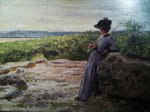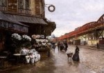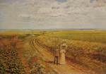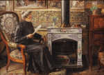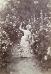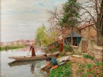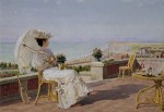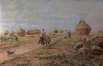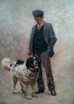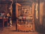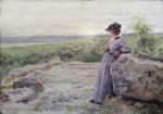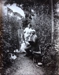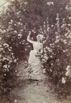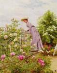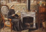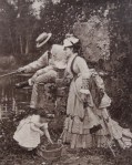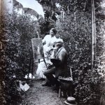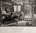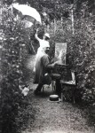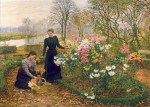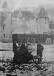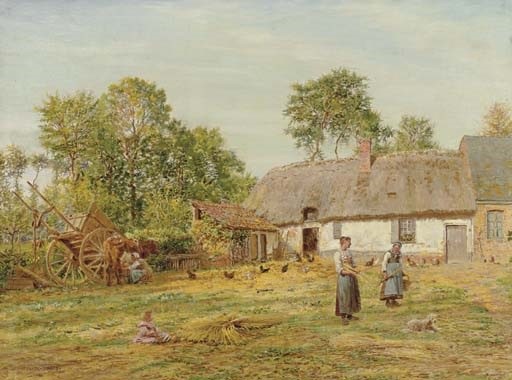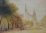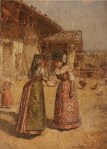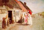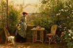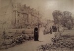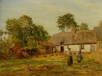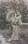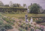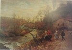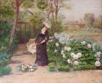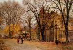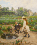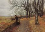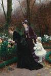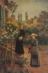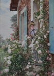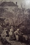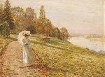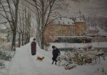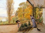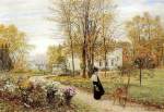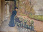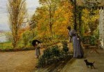 - ‘L’Automne’ Ð autumn scene with woman and dog on steps in front of house, girl on drive holding flowers and umbrella and trees in autumn foliage