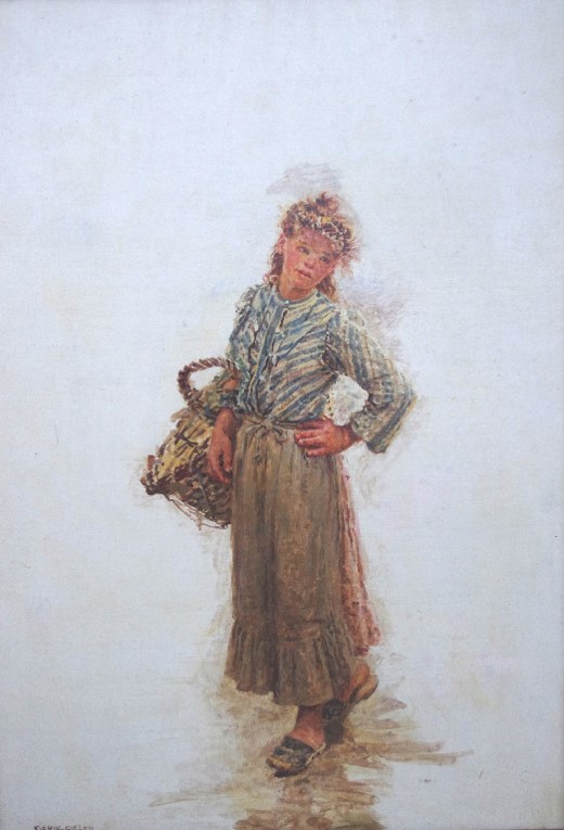 - ‘L’Automne’ Ð autumn scene with woman and dog on steps in front of house, girl on drive holding flowers and umbrella and trees in autumn foliage