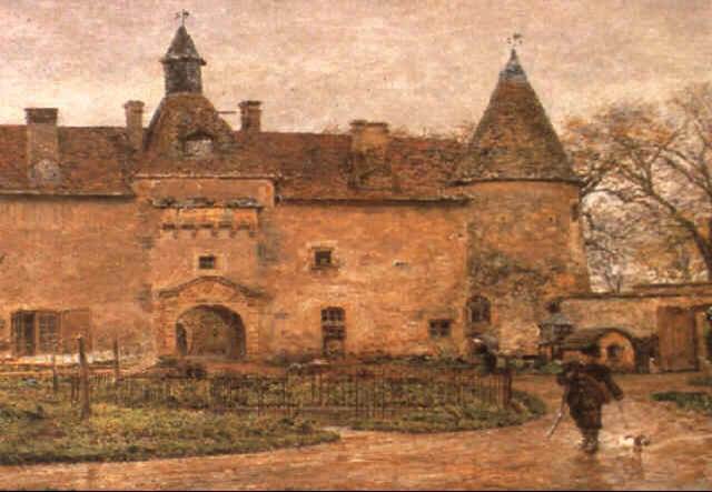 - ‘L’Automne’ Ð autumn scene with woman and dog on steps in front of house, girl on drive holding flowers and umbrella and trees in autumn foliage