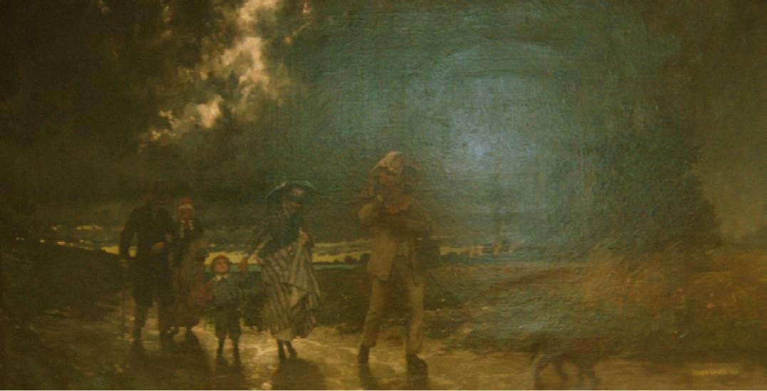 - ‘L’Automne’ Ð autumn scene with woman and dog on steps in front of house, girl on drive holding flowers and umbrella and trees in autumn foliage