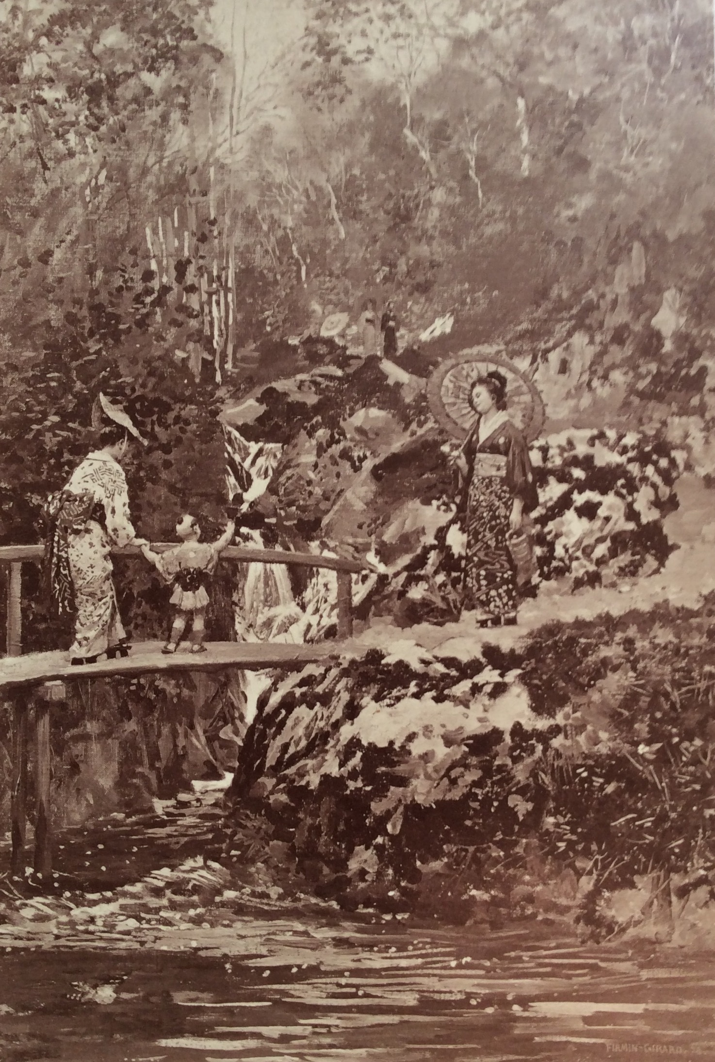 - ‘L’Automne’ Ð autumn scene with woman and dog on steps in front of house, girl on drive holding flowers and umbrella and trees in autumn foliage