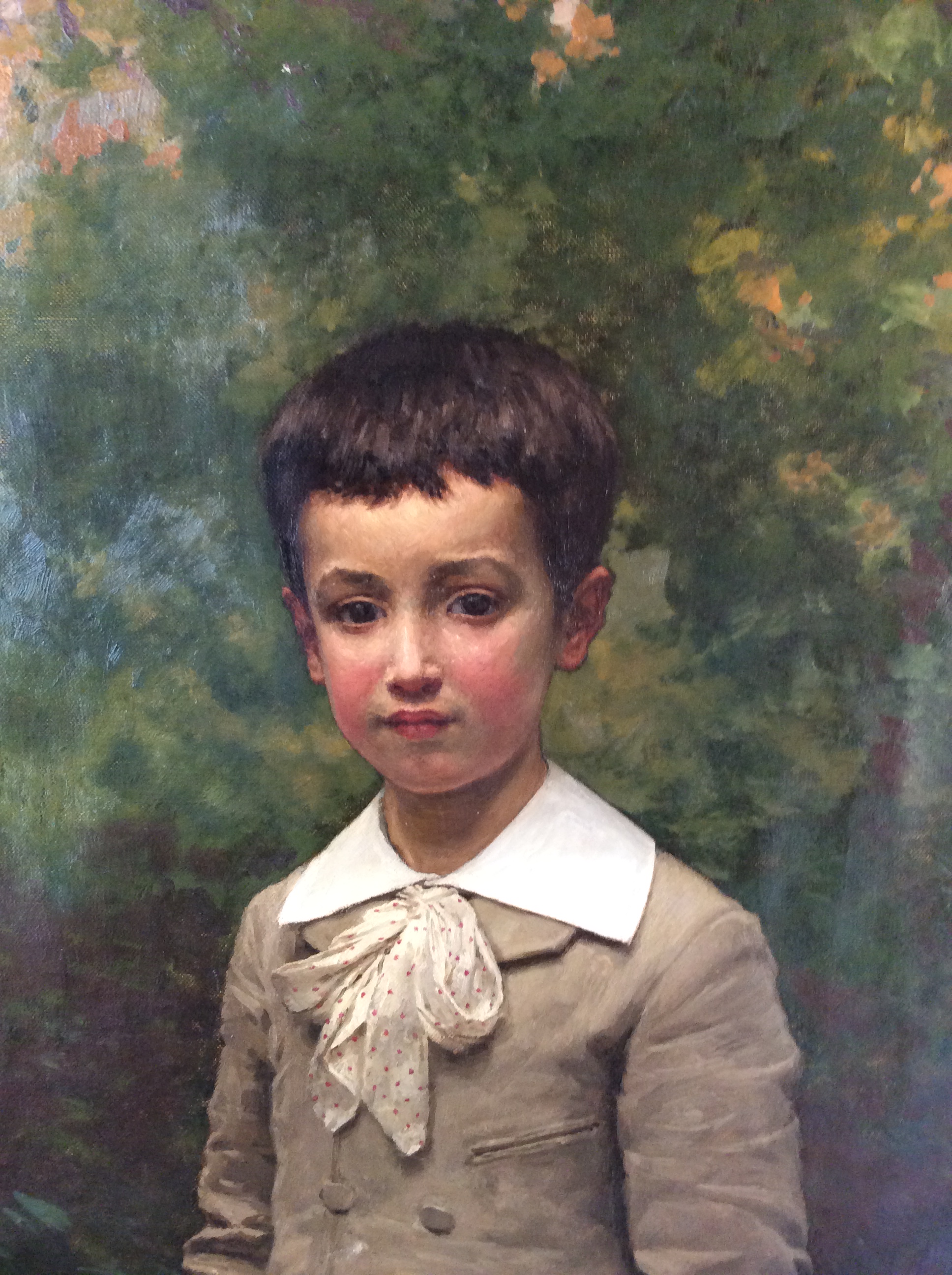 - ‘L’Automne’ Ð autumn scene with woman and dog on steps in front of house, girl on drive holding flowers and umbrella and trees in autumn foliage