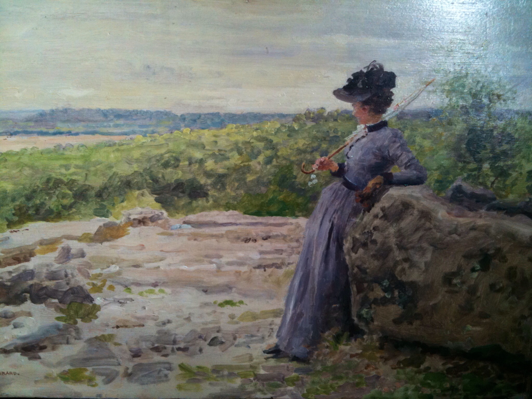 - ‘L’Automne’ Ð autumn scene with woman and dog on steps in front of house, girl on drive holding flowers and umbrella and trees in autumn foliage