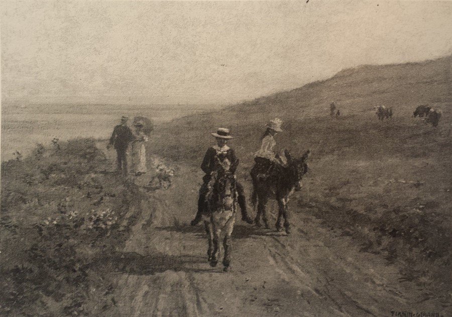 - ‘L’Automne’ Ð autumn scene with woman and dog on steps in front of house, girl on drive holding flowers and umbrella and trees in autumn foliage