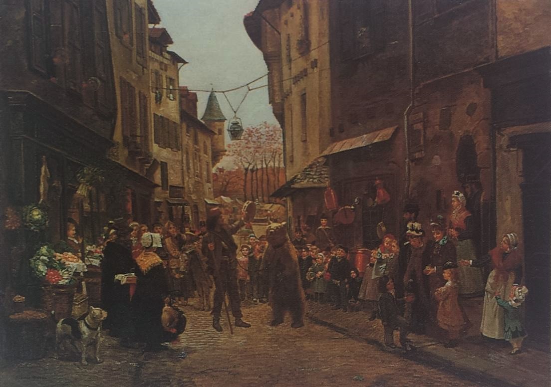 - ‘L’Automne’ Ð autumn scene with woman and dog on steps in front of house, girl on drive holding flowers and umbrella and trees in autumn foliage