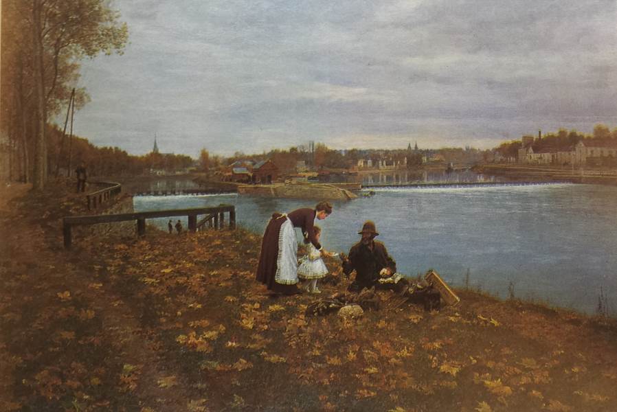 - ‘L’Automne’ Ð autumn scene with woman and dog on steps in front of house, girl on drive holding flowers and umbrella and trees in autumn foliage