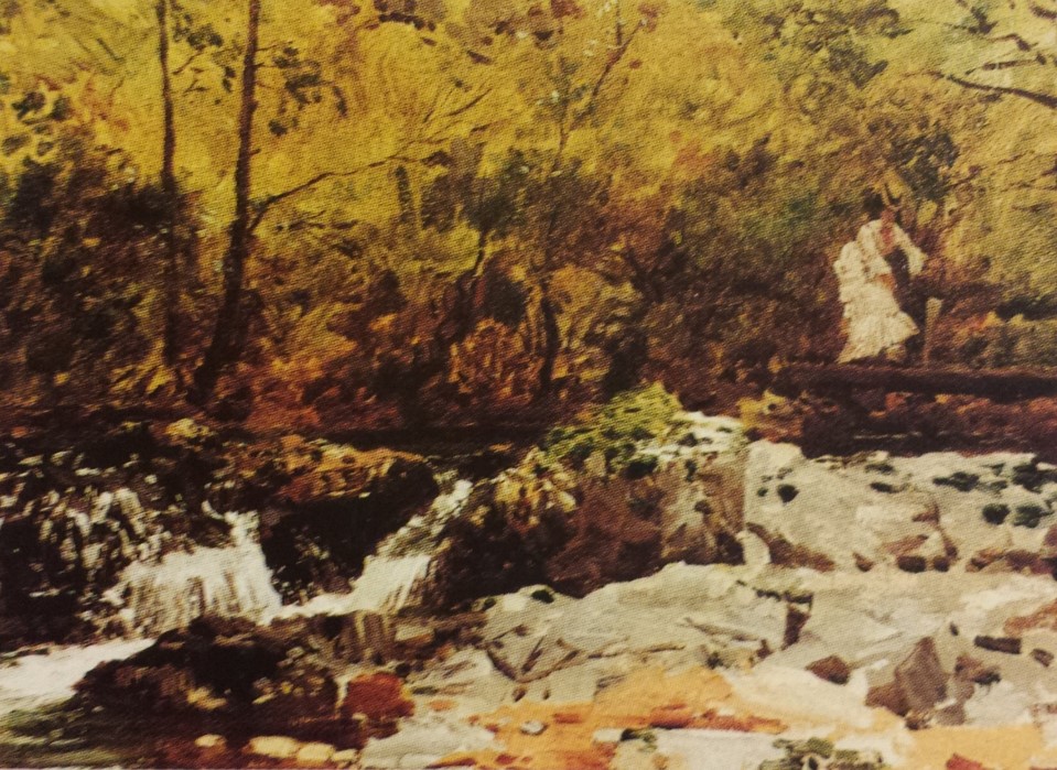 - ‘L’Automne’ Ð autumn scene with woman and dog on steps in front of house, girl on drive holding flowers and umbrella and trees in autumn foliage