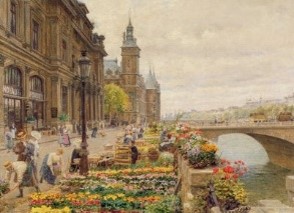 - ‘L’Automne’ Ð autumn scene with woman and dog on steps in front of house, girl on drive holding flowers and umbrella and trees in autumn foliage