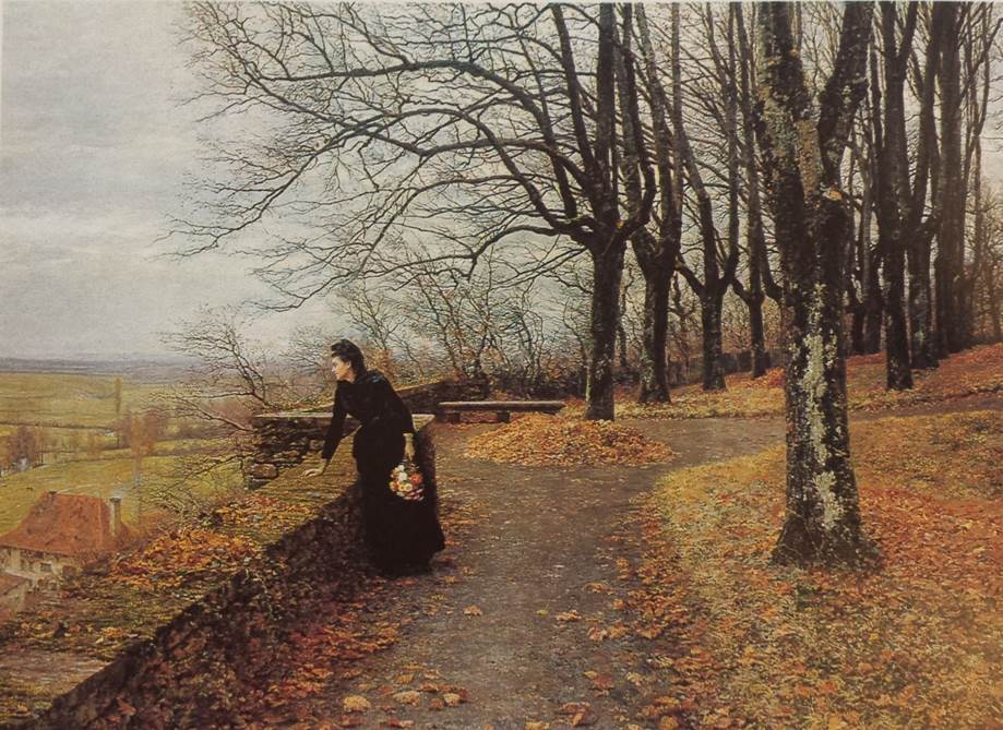 - ‘L’Automne’ Ð autumn scene with woman and dog on steps in front of house, girl on drive holding flowers and umbrella and trees in autumn foliage