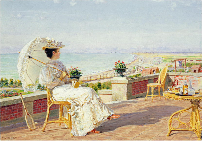 - ‘L’Automne’ Ð autumn scene with woman and dog on steps in front of house, girl on drive holding flowers and umbrella and trees in autumn foliage